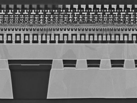 Микрофотография процессора с PowerVia в разрезе: сверху – слои сигнальной сети межсоединений (темные участки – металлические контакты, светлые – изолирующий диэлектрик), примерно на 1/3 высоты кадра от верхнего его обреза видна тонкая прерывистая светлая линия – слой кремния с транзисторными структурами на нем, ниже – U-образные контакты сети питания первого уровня, а еще ниже – слои PDN. Источник: Intel.