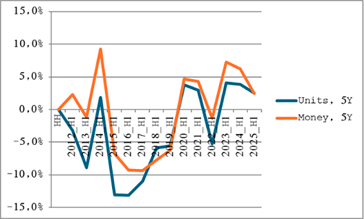 Рис. 2.3. Пятилетний CAGR. В Штуках и деньгах.