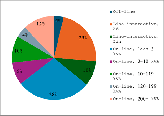 На рынке ИБП представлено несколько топологий аппаратов: резервные (Off-line); интерактивные (Line-interactive AS и SIN) и двойного преобразования (On-line). On-line ИБП в свою очередь разделяются на пять подгрупп, исходя из их диапазонов мощностей: до 3 кВА, от 3 до 10 кВА, 10-120 кВА, 120-200 кВА и свыше 200 кВА.