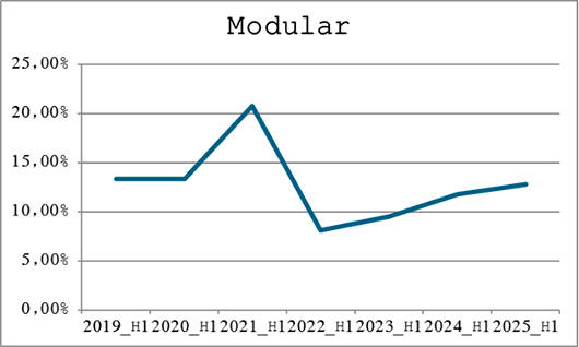 Рис. 3.5. Динамика доли модульных решений в общем рынке. В деньгах.