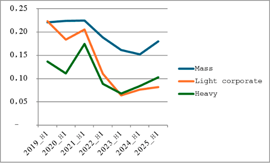 Массовый сегмент, несмотря на нисходящий тренд, в 1 полугодии 2025 г. чувствовал себя лучше рынка (см. рис. 3.3 и 3.4). Причем денежные показатели отрасли даже уверенней. Это было связано, скорее всего, с увеличением средней мощности в классе, поднявшейся с уровня 865 до 880 ВА.
