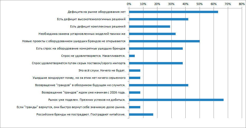 Также примерно та же степень уверенности в том, что «дефицита оборудования нет», что явно является очевидным препятствующим фактором к возврату. НО! При этом половина экспертов уточняет, что «есть дефицит высокотехнологичных решений» и 29% считает, что «есть дефицит комплексных решений». То есть всё же определенная ниша, где изменения возможны и для некоторых заказчиков, возможно, даже желательны, всё же есть.