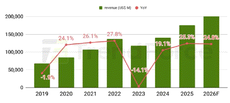Аналитики прогнозируют бурный рост выручки компаний, изготавливающих микросхемы, причем не только по самым передовым технологическим нормам «3/2 нм» (как TSMC), но и по техпроцессу «5/4 нм», как корейская Samsung Foundry, загруженная заказами на специализированные ИИ-ускорители.