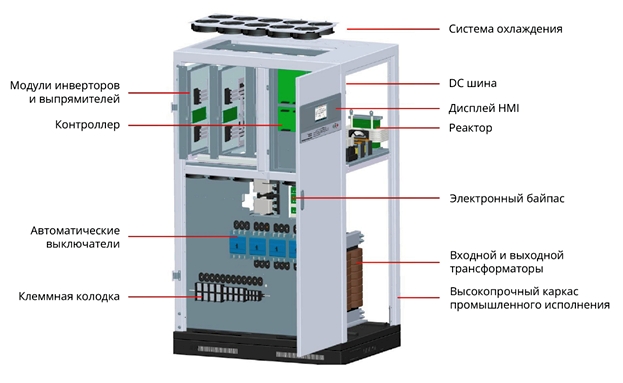 ИБП с трансформаторами на входе выпрямителя и выходе инвертора без трансформатора на линии байпас и конфигурация с одним трансформатором на выходе инвертора, сглаживающим броски тока при запуске защищаемого оборудования. Данные решения отлично подходят для сфер, где не так активно наблюдаются динамические изменения нагрузок.