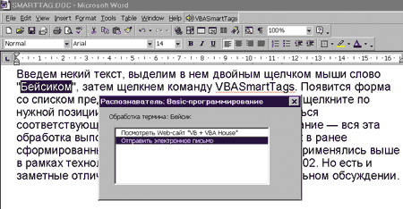 Рис. 3. Формирование и обработка смарт-тегов методами VBA в Word 2002.